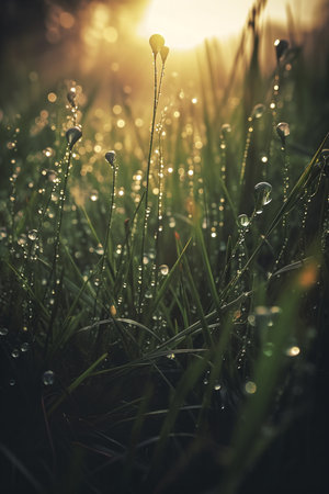 Sunrise illuminates dewdrops on blades of grass in a serene meadow.