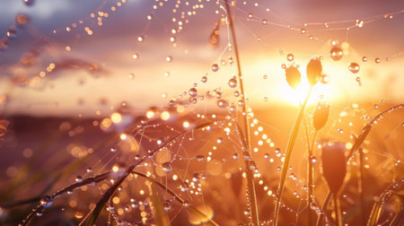 A tranquil scene of water droplets forming on a dew-covered spiderweb at dawn