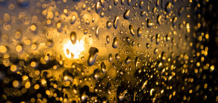 Drops of rain on the glass at sunset