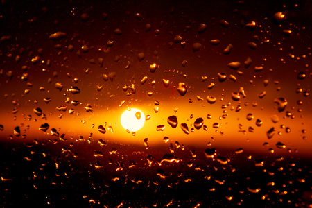 A mesmerizing sunset viewed through a rain-covered window, with bokeh effects and the orange sun glowing softly behind the wet glass
