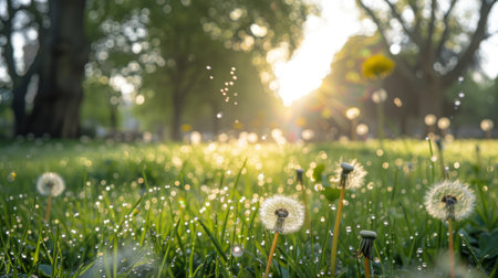 dandelion seeds with dew in an urban park generative ai