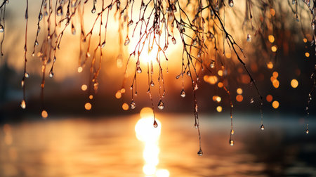 Rain-soaked willow branches dripping water, reflecting the warm hues of sunset, tranquil riverbank generative ai