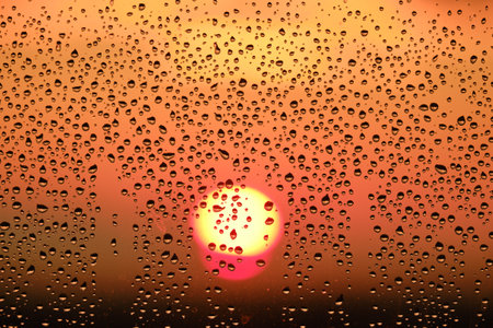 Background of water drops at red sun, beautiful window glass and copy space for text