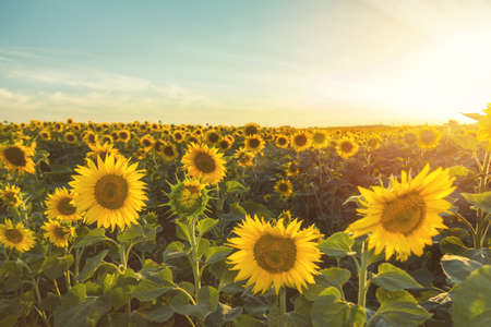 Sunflower field at sunset. Beautiful landscape with sunflowers.