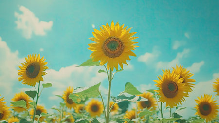 sunflower field, with tall sunflowers standing against a clear blue sky, their bright yellow petals glowing in the sunlight, symbolizing summer's warmth and energy.