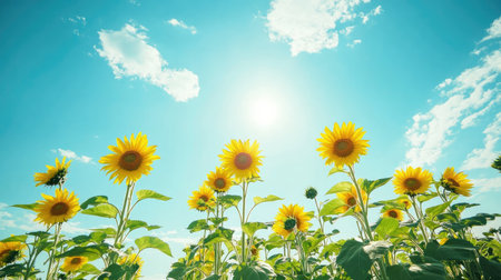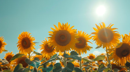 A field of yellow sunflowers with the sun shining on them. The sunflowers are in full bloom and the field is lush and green. Concept of warmth and happiness