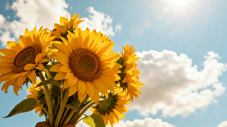 A stunning display of sunflowers in full bloom under a vibrant blue sky dotted with fluffy clouds, embodying the essence of summer and tranquility.
