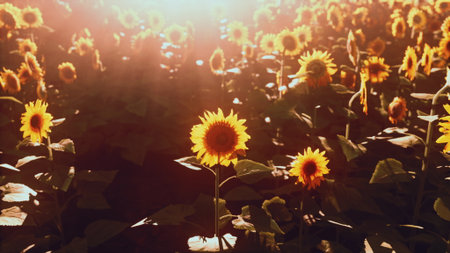 a field of beautiful bright colors of sunflowers in the sunset time