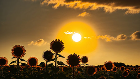 Sunflowers stand silhouetted against a brilliantly golden sunset sky. AI generated image