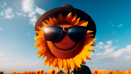 A playful image of a sunflower wearing sunglasses on a bright sunny day, capturing the fun and vibrant essence of summer.