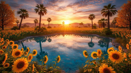 Sunflowers surround a reflecting pool at sunrise