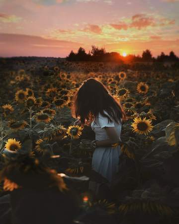 A person walking through a field of sunflowers in various stages of growth representing the cycle of life and how all things must come to an end and begin again