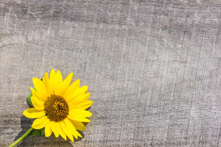 Yellow sunflower on wooden background, close up, copy space.