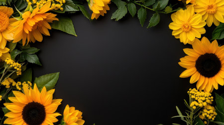 Sunflower fresh flowers heads on yellow, flat lay floral border with copy space