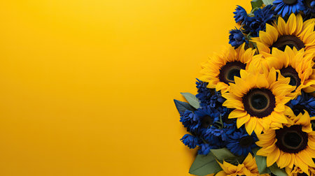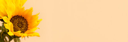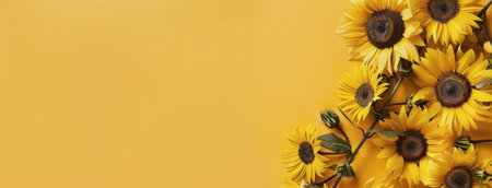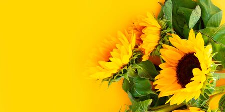 Sunflowers fresh flowers close up on yellow background with copy space, naturall fall flowers background banner