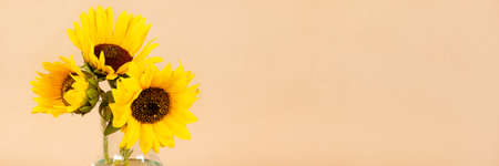 Bouquet of yellow sunflowers in a glass vase, banner with copy space. Wide panoramic header