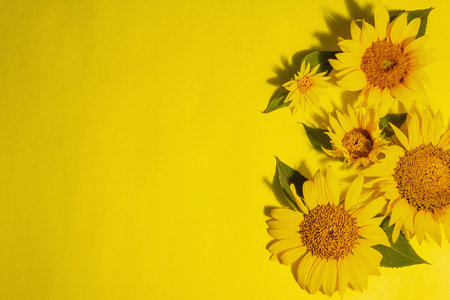 Beautiful fresh sunflowers on bright yellow background. Flat lay, top view, copy space. Autumn or summer Concept, harvest time, agriculture. Sunflower natural background. Flower card.