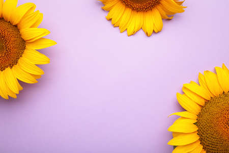 Beautiful fresh sunflowers on purple background. Autumn or summer Concept, harvest time, agriculture. Sunflower natural background.