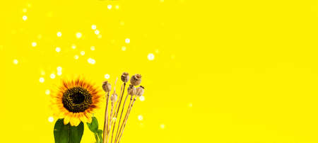 Bright Sunflower and dry poppy on yellow background. Harvest festival. Creative Summer Composition. Close-up