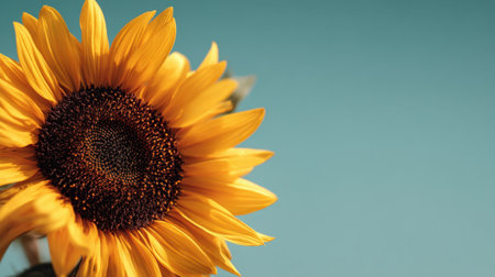 A stunning close-up of a sunflower with bright yellow petals against a soft blue background. This image captures the essence of summer and natural beauty.