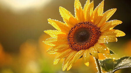 A detailed shot of a sunflower with dew drops on its petals, reflecting sunlight, emphasizing the morning freshness and natural beauty.