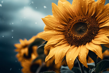 A close up of a sunflower with water droplets on it. AI generative image.