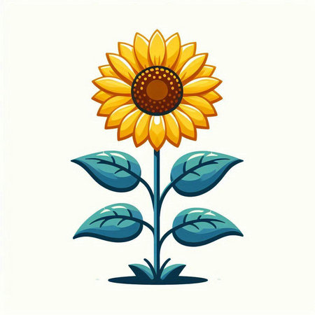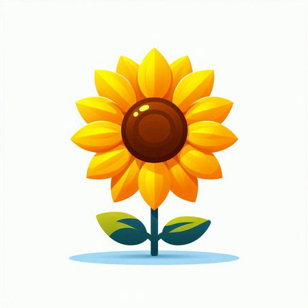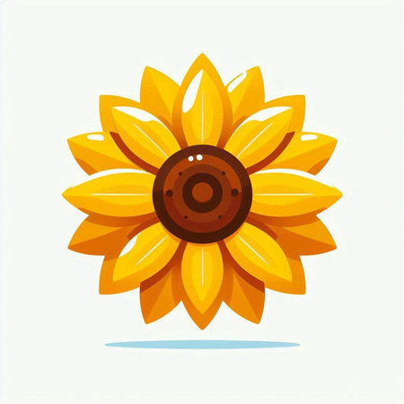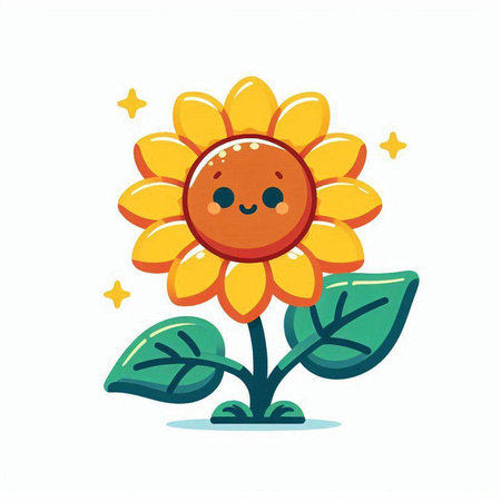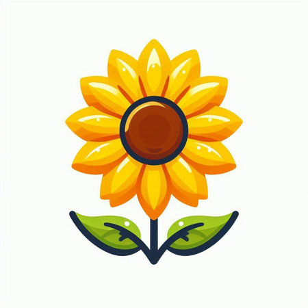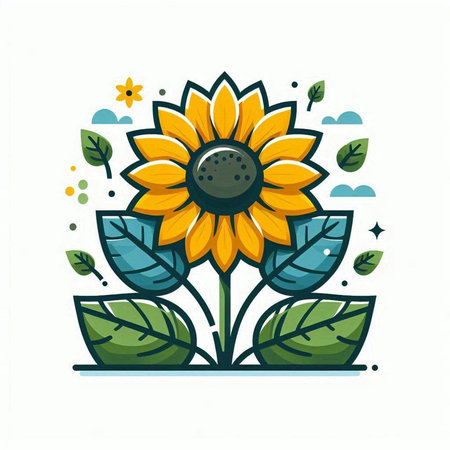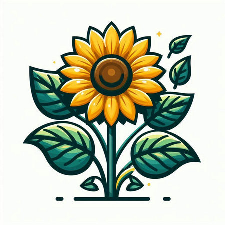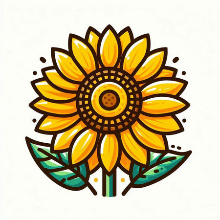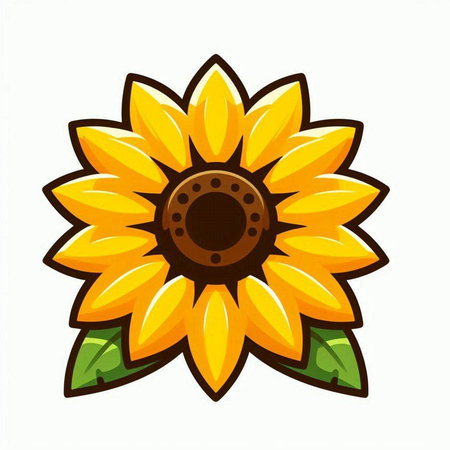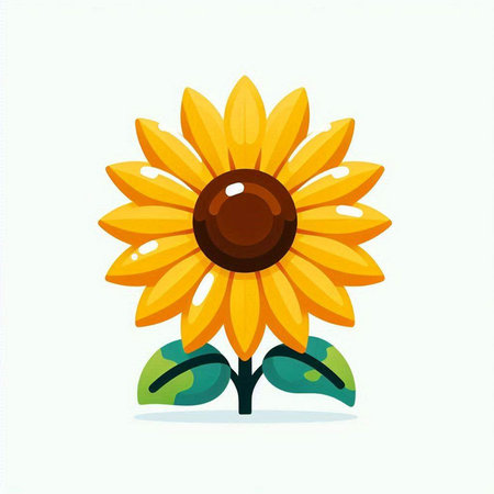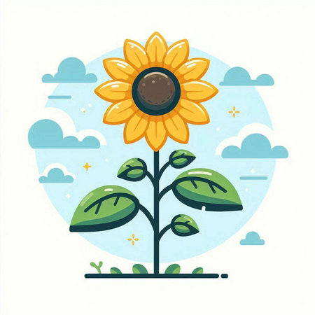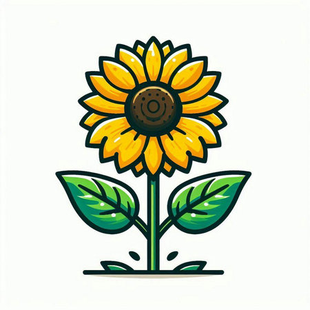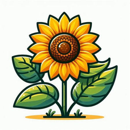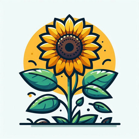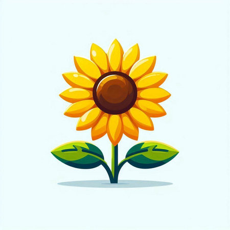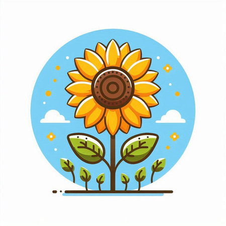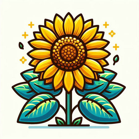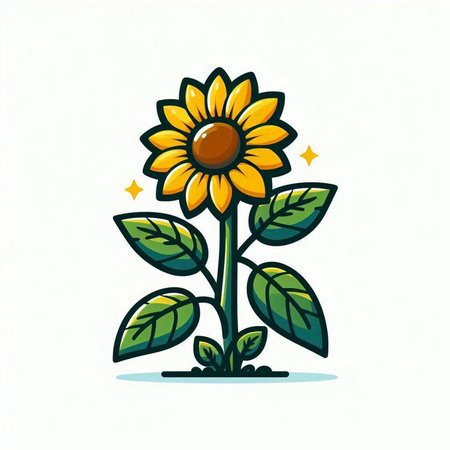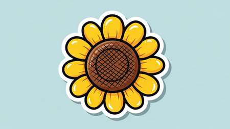 This illustration features a cartoon sunflower with bright yellow petals and a brown center, rendered in a sticker-like style. The composition is simple, set against a light blue backdrop, with a defined outline. It is suitable for various applications, including print and digital projects, and can be used in commercial and editorial contexts.