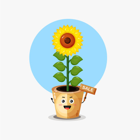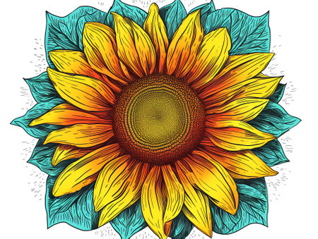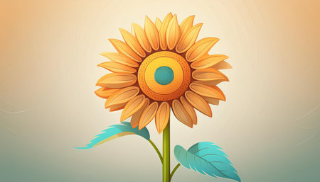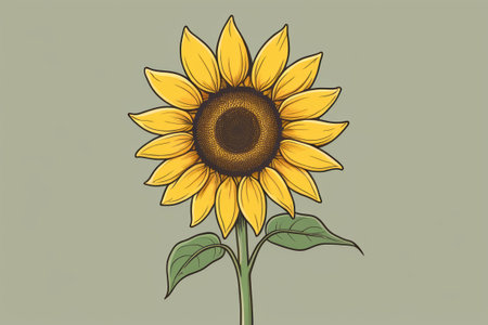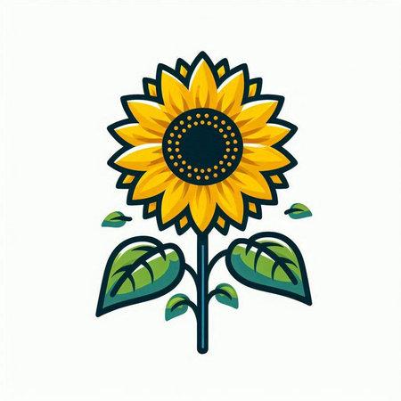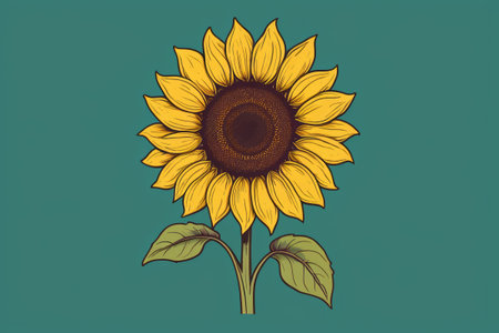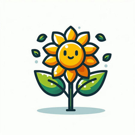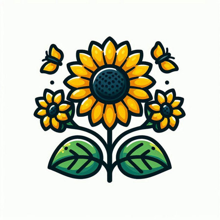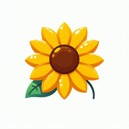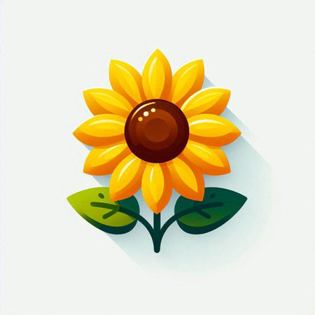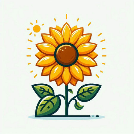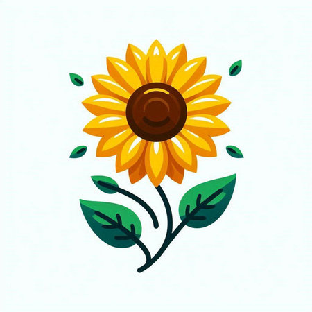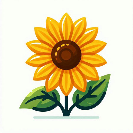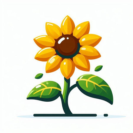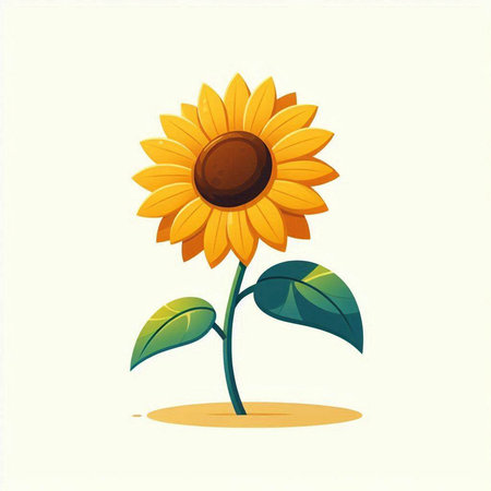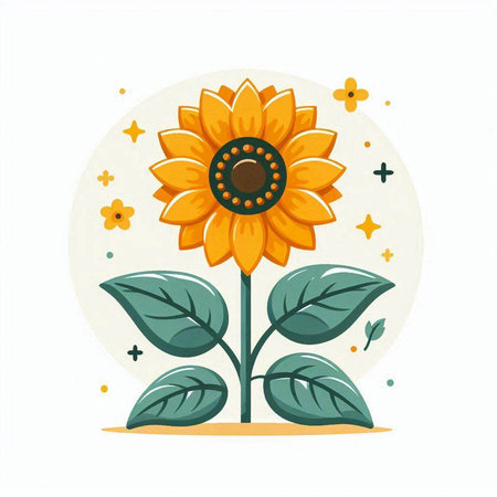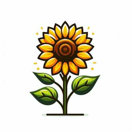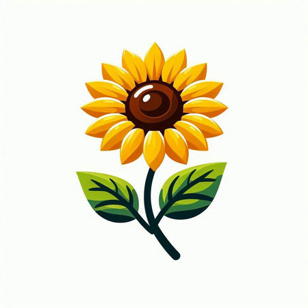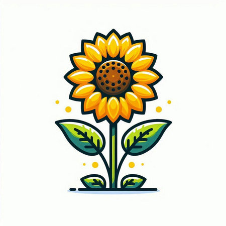 This illustration features a cartoon sunflower with bright yellow petals and a brown center, rendered in a sticker-like style. The composition is simple, set against a light blue backdrop, with a defined outline. It is suitable for various applications, including print and digital projects, and can be used in commercial and editorial contexts.