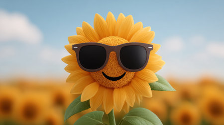 A whimsical sunflower wearing sunglasses bursts with personality in a bright field. This playful and cheerful flower symbolizes joy and summer vibes, creating a joyful atmosphere.