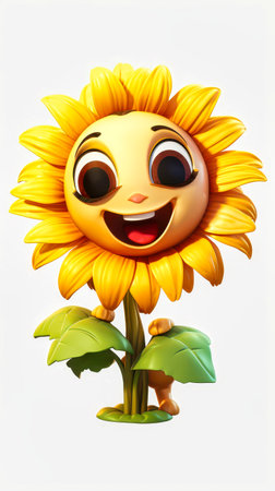 Cartoon sunflower with big eyes, yellow background, tall and cheerful