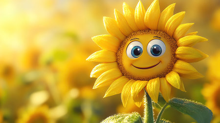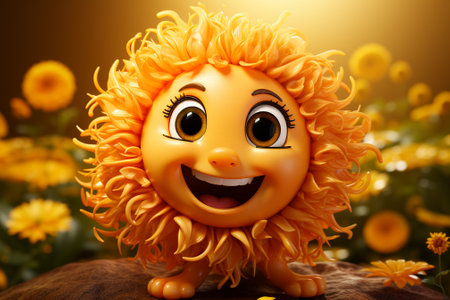 Adorable sunflower character with a fluffy appearance, smiling in a colorful meadow filled with flowers, radiating happiness and the essence of nature's charm, AI generated