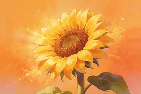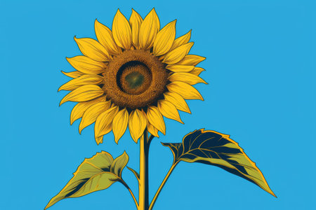This vibrant sunflower stands tall against a soft blue background, showcasing its cheerful yellow petals and green leaves, perfect for nature-themed projects.