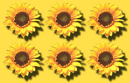A beatiful pattern created of yellow sunflowers on beige background. Top view.
