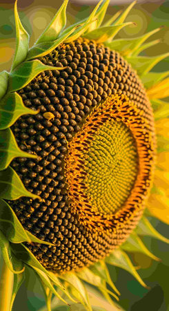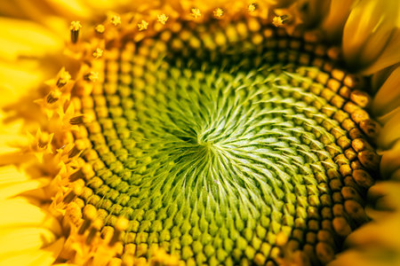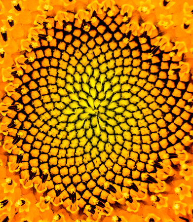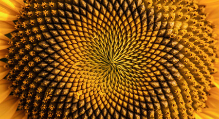 A close up shot of a sunflower's center reveals intricate details of seeds and petals, emphasizing textures and patterns.
