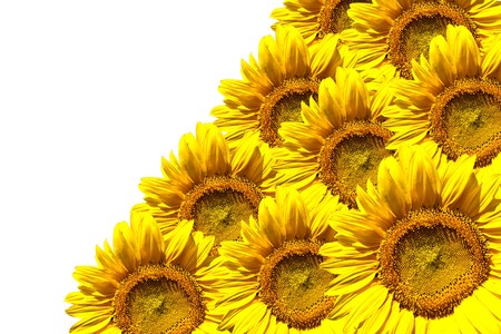 Sunflower fresh flowers heads on yellow, flat lay floral border with copy space