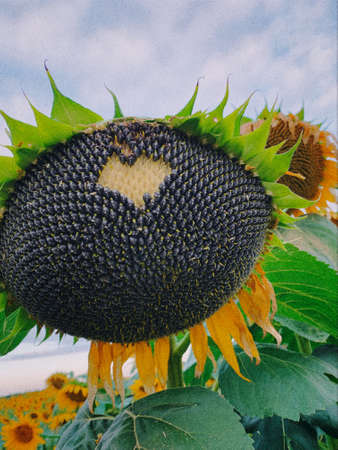 Majestic agricultural landscape, farming view with sunflowers field and beautiful sky. Vintage stylization, retro film filter