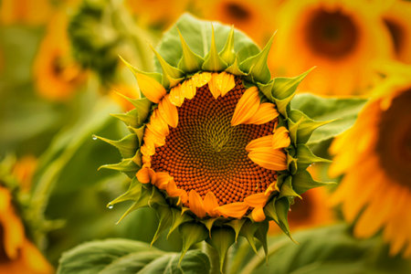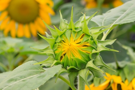 Burgeon sunflower bud. Blooming young flora concept of new start