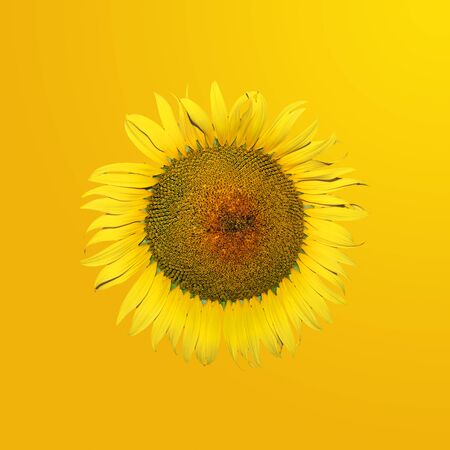 Sunflower with close on a yellow background. ripe sunflower seeds
