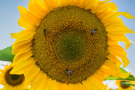 A close-up of a sunflower in a blue sky. selective focus. Growing sunflowers.