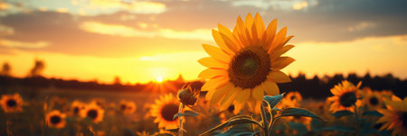 Sunflower Field With A Blurred Golden Hour Ambiance. banner for web
