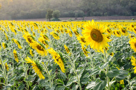 Bright yellow sunflower on big agricultural field with sunset light background, summer nature flower
