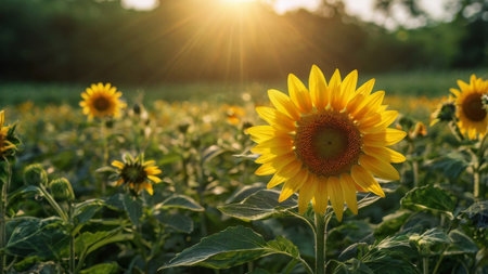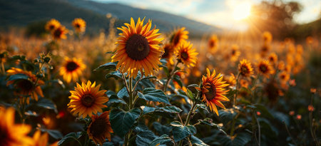 Sunflowers stand tall and bright under the warm glow of the setting sun. Their yellow petals create a stunning contrast against the green foliage, capturing natures beauty.