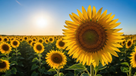 Picturesque view of a vibrant sunflower field basking under the radiant sunlight with a pristine blue sky in the background