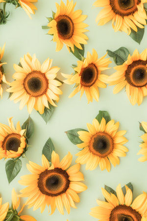 Sunflowers with green leaves on light green background, top view, flat lay. Vertical.
