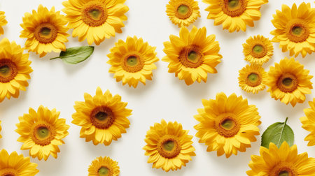 Numerous bright yellow sunflowers with dark centers are arranged on a clean white surface, featuring green leaves and stems with soft shadows.