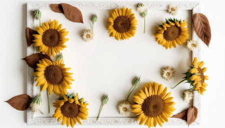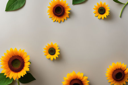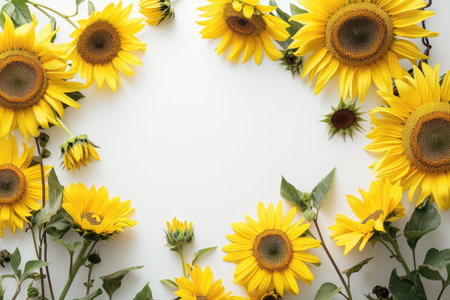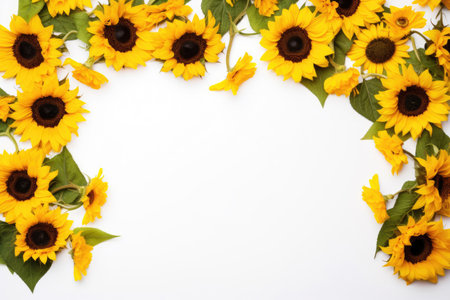 Creative layout made with sunflowers on bright white background, top view, by ai generative
