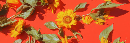 Scattering of sunflower petals and leaves on a vibrant crimson background for creative designs