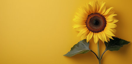 A Bright sunflower with yellow petals and green leaves on yellow background