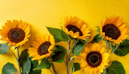 beautiful fresh sunflowers with leaves on stalk on bright yellow background flat lay top view copy space autumn or summer concept harvest time agriculture sunflower natural background