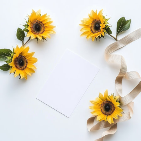 Flat lay of a blank white card on top, with sunflowers and a beige ribbon next to it, against a white background. High-resolution photography, minimalistic style, very realistic, sharp focus, bright professional lighting, soft shadows, light colors, white background, rendered in Octane, hyper-realism, photorealistic, boho style. --v 6.1 Job ID: f50a15b3-eebd-4950-8b2a-081551d9bd24
